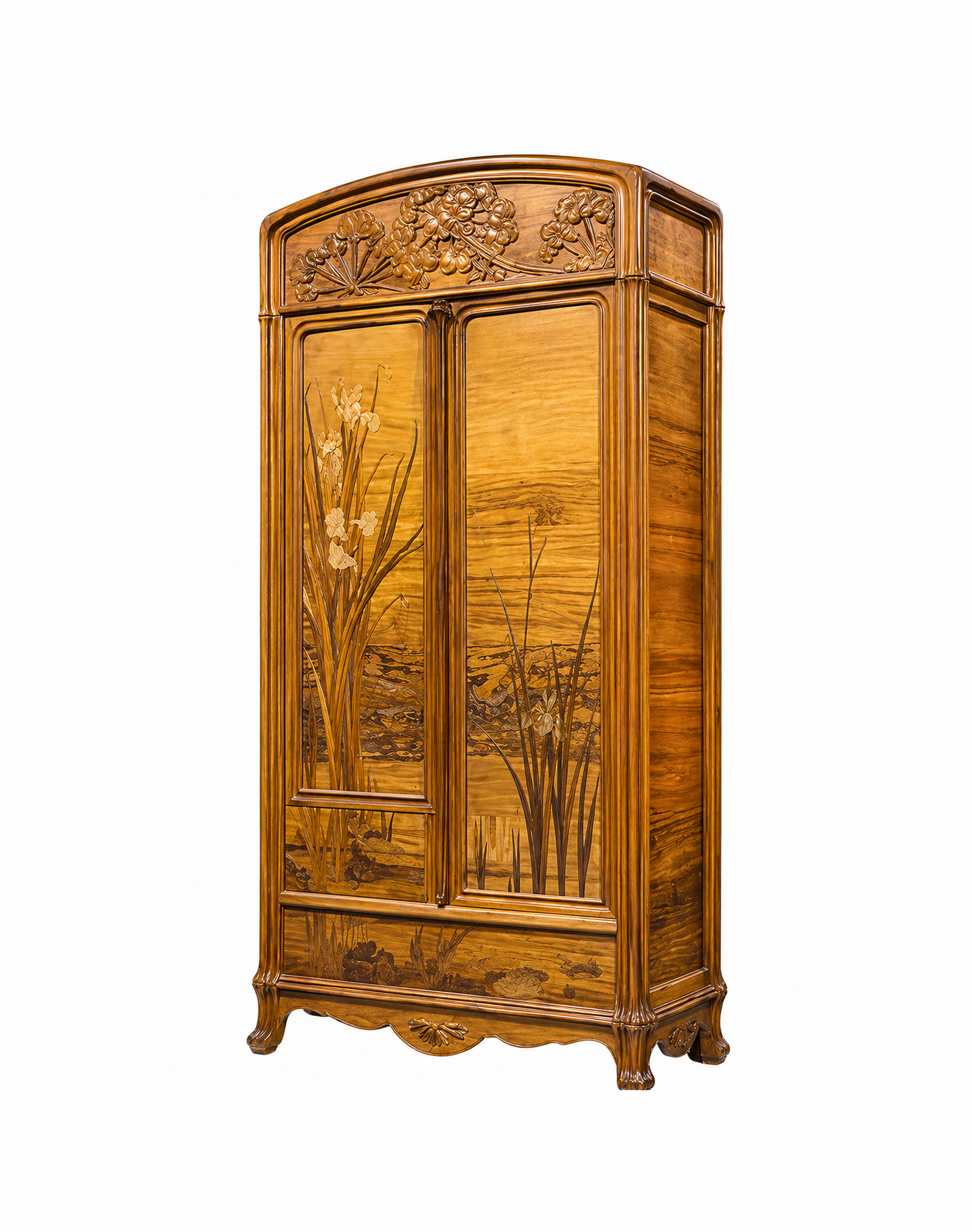 Carved and moulded walnut with vegetal motifs, featuring a marquetry background with cut-out meadow hogweed, marsh irises, and dragonflies. The upper section is decorated with carved umbels