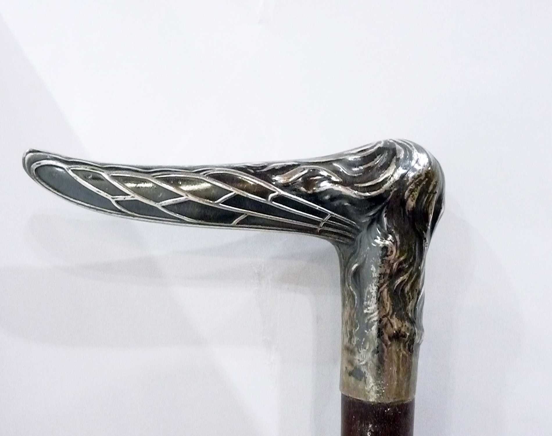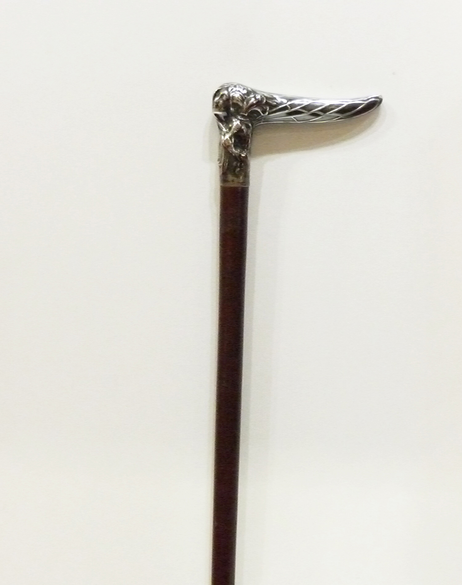 Wooden cane with a silver knob depicting a woman playing a mandolin