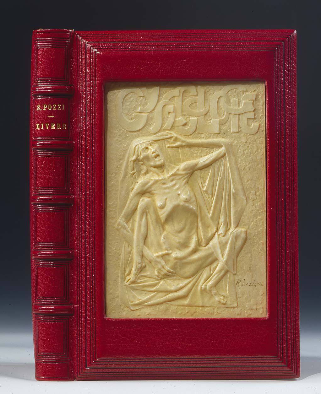 Signed. Spine with raised bands, titled S. POZZI – DIVERS in gold. Handwritten letter signed by Lalique dated 16 mars 1907