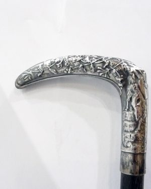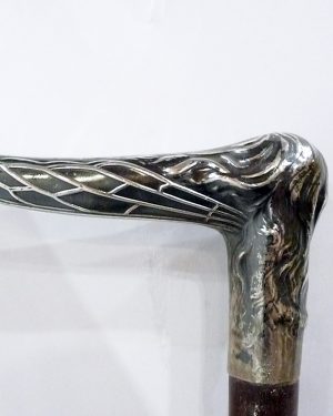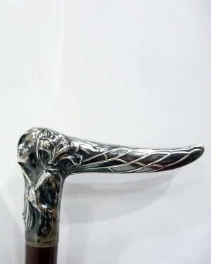 Wooden cane with a silver knob depicting a woman playing a mandolin