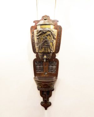 The fountain is presented on its carved wooden panel