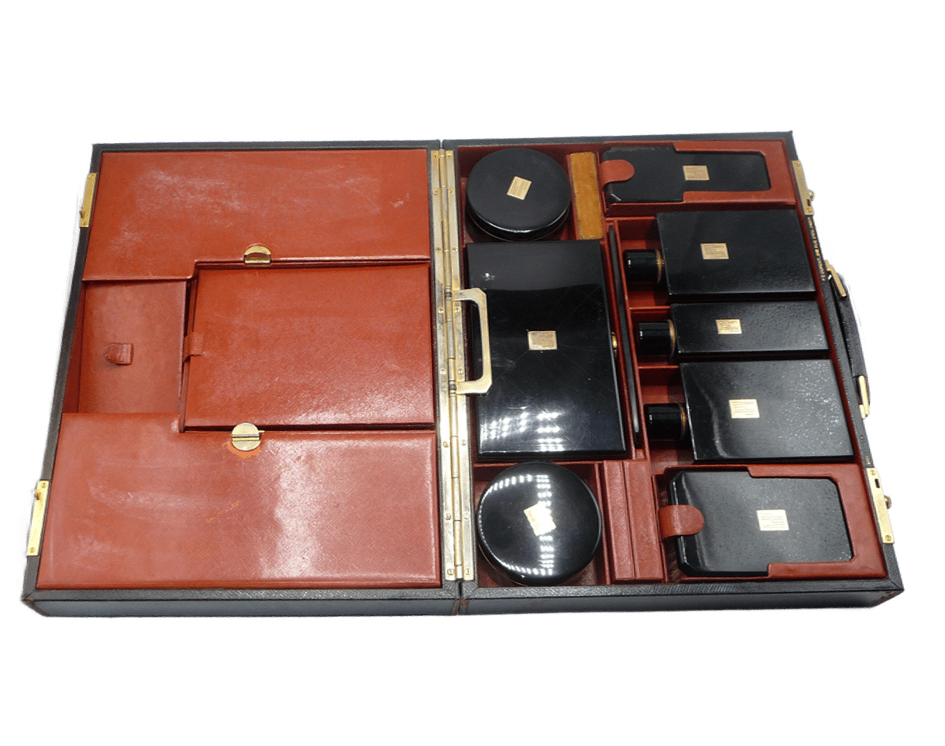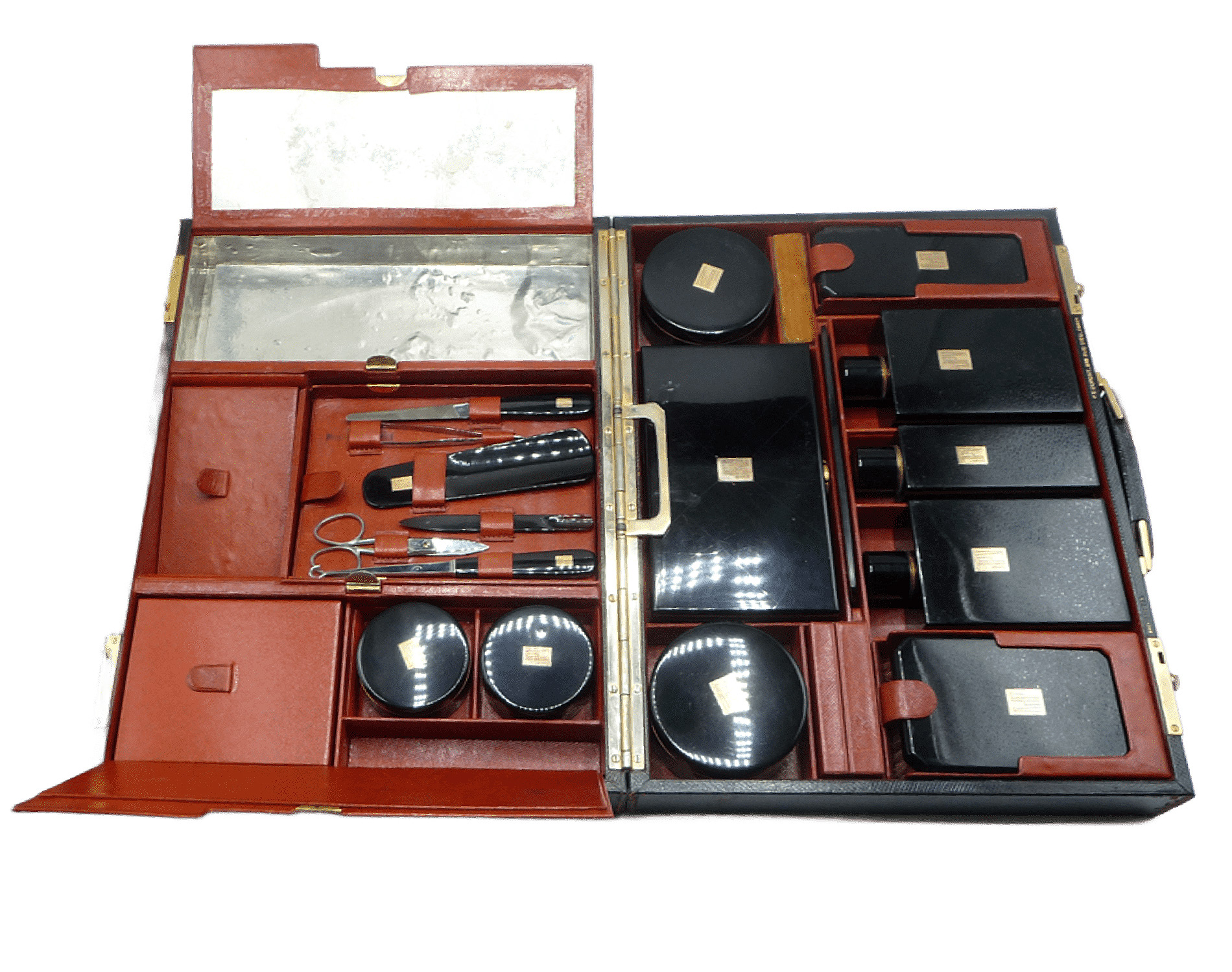 Red and black leather travel suitcase containing a gentleman’s toiletry set in silver and black lacquer