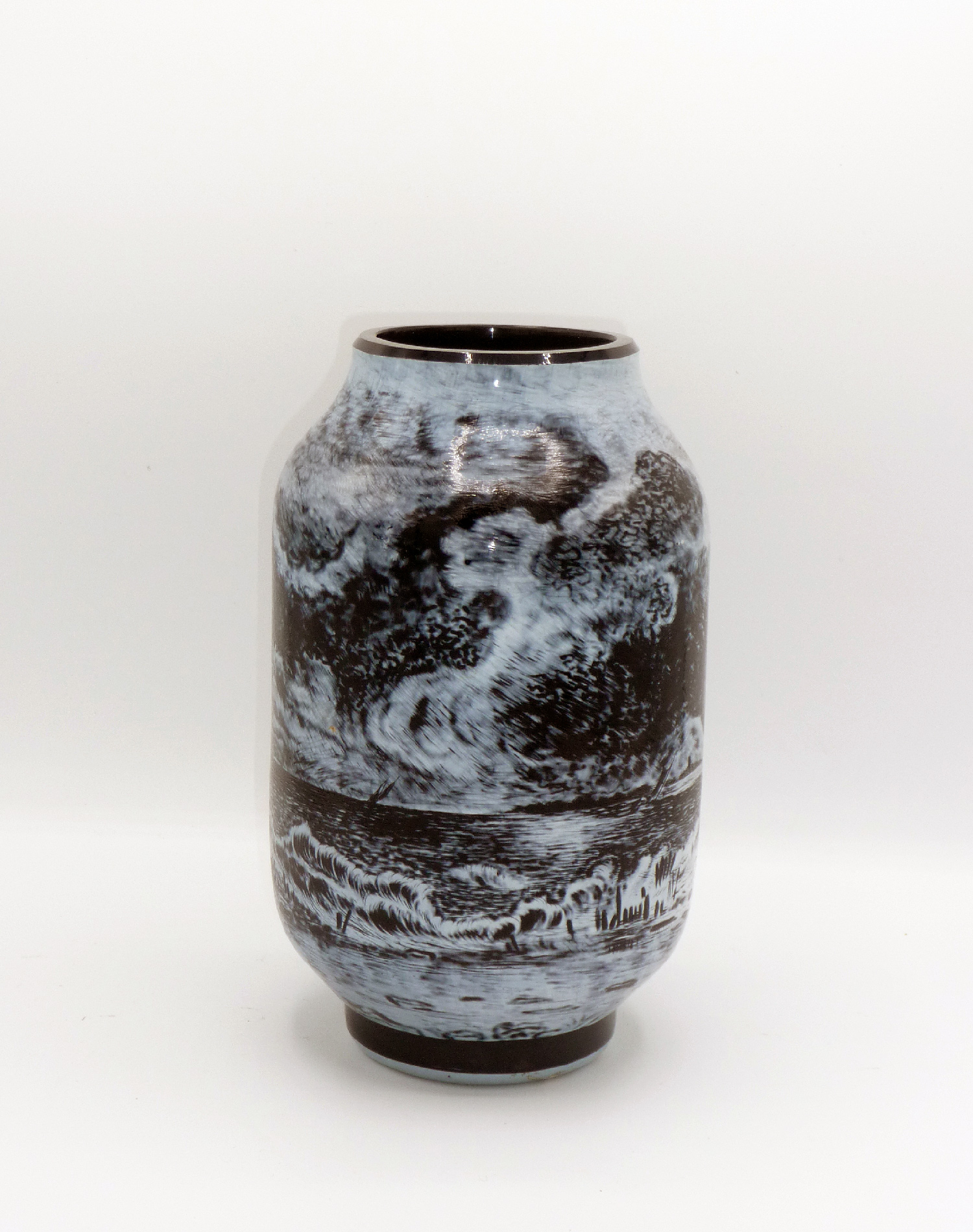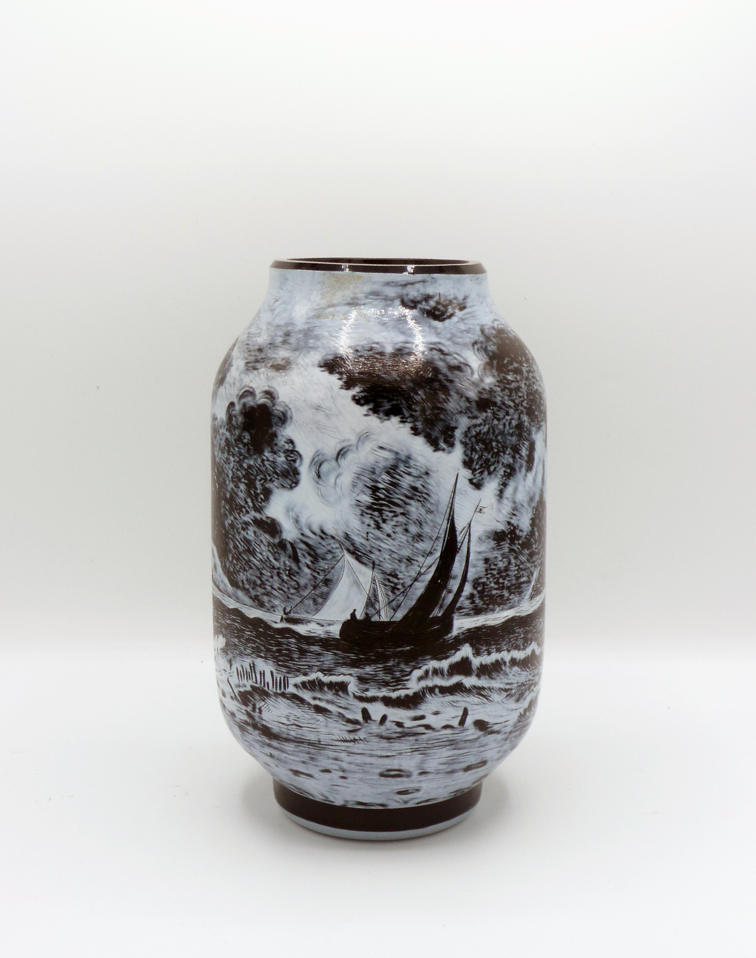 Acid-etched and wheel-carved in white on a black background. Decor of seascapes and sailboats