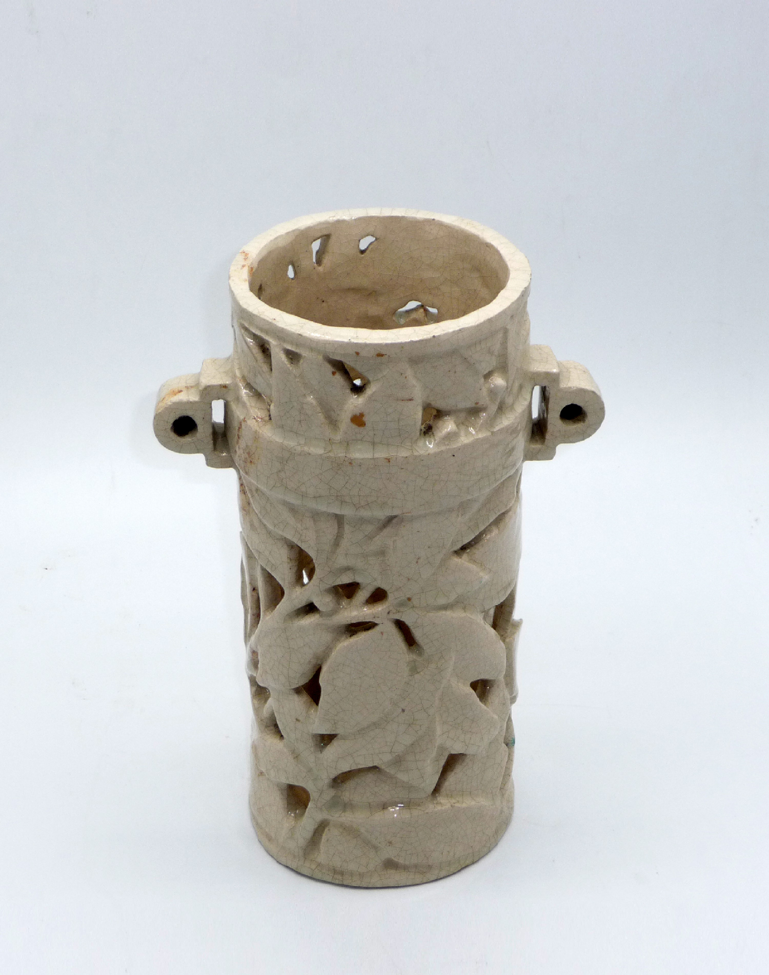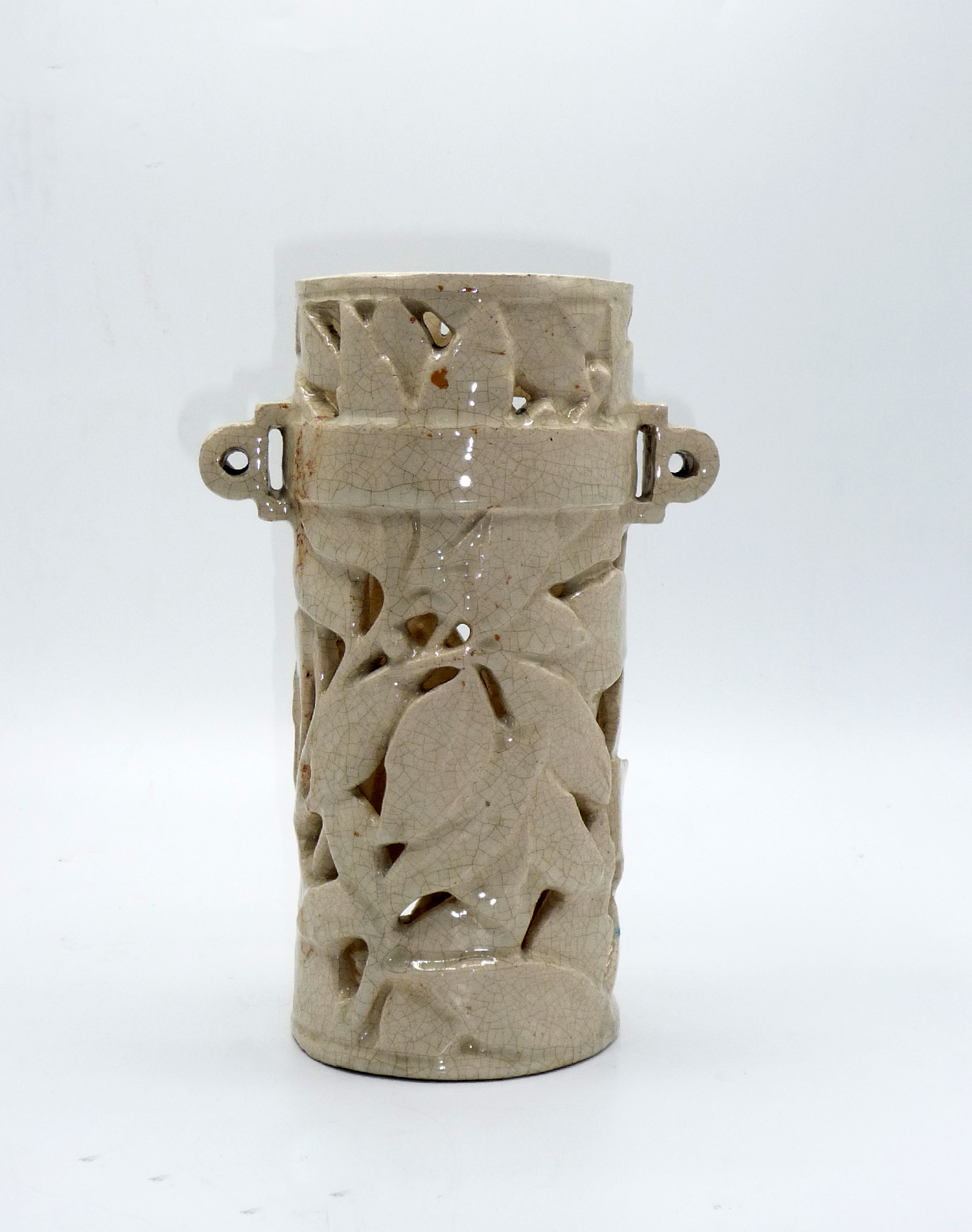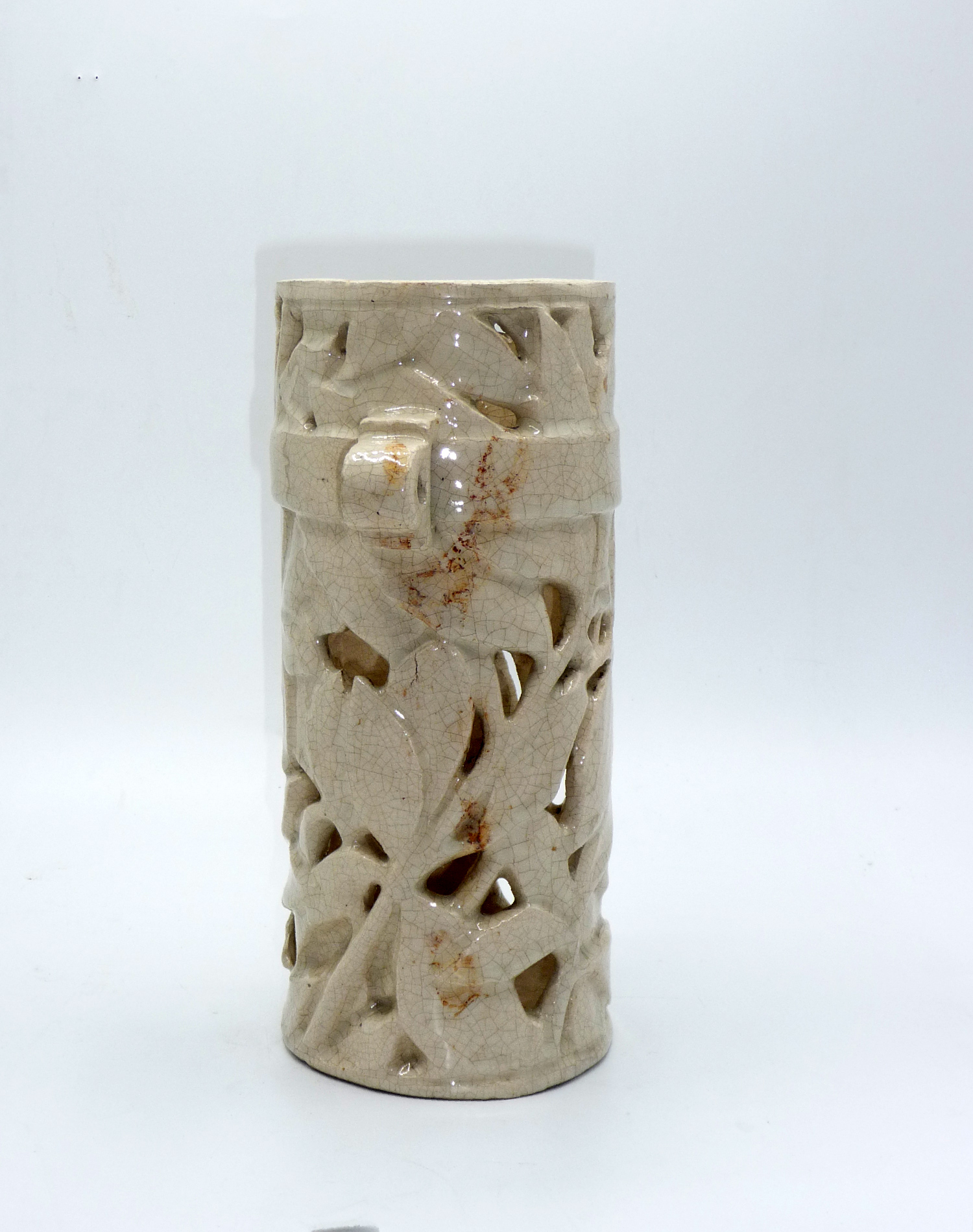 Roll-shaped faience vase with openwork decoration, featuring lateral handles on a decorative band encircling the body.